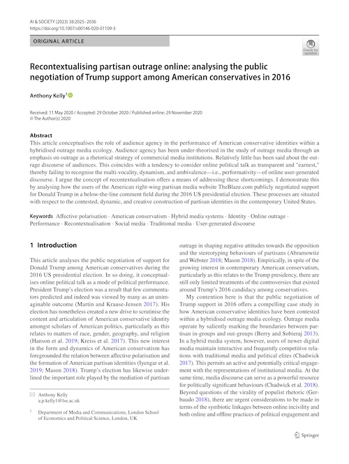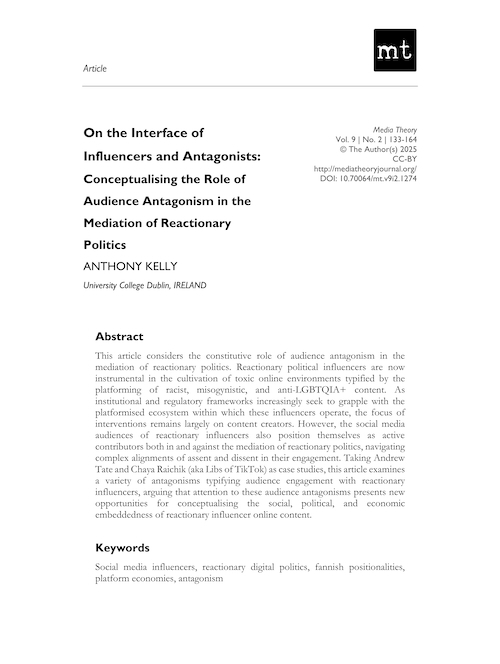 I hold a PhD in Media and Communications from the London School of Economics and Political Science (LSE), awarded in 2021. My doctoral research, supported by an NUI travelling Studentship in Media and Communications, analysed the convergence of digital politics, online partisan media, and affective polarisation during the 2016 US presidential election. My postdoctoral research, funded by Taighde Éireann – Research Ireland, elaborated on my earlier doctoral work to explore how the social media audiences of reactionary political influencers seek to participate in the mediation of reactionary politics in the context of new creator economies.